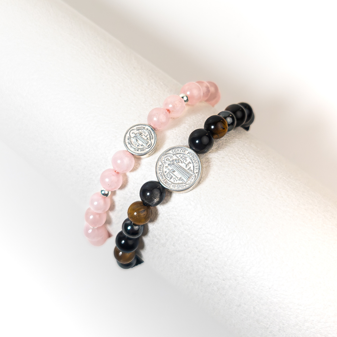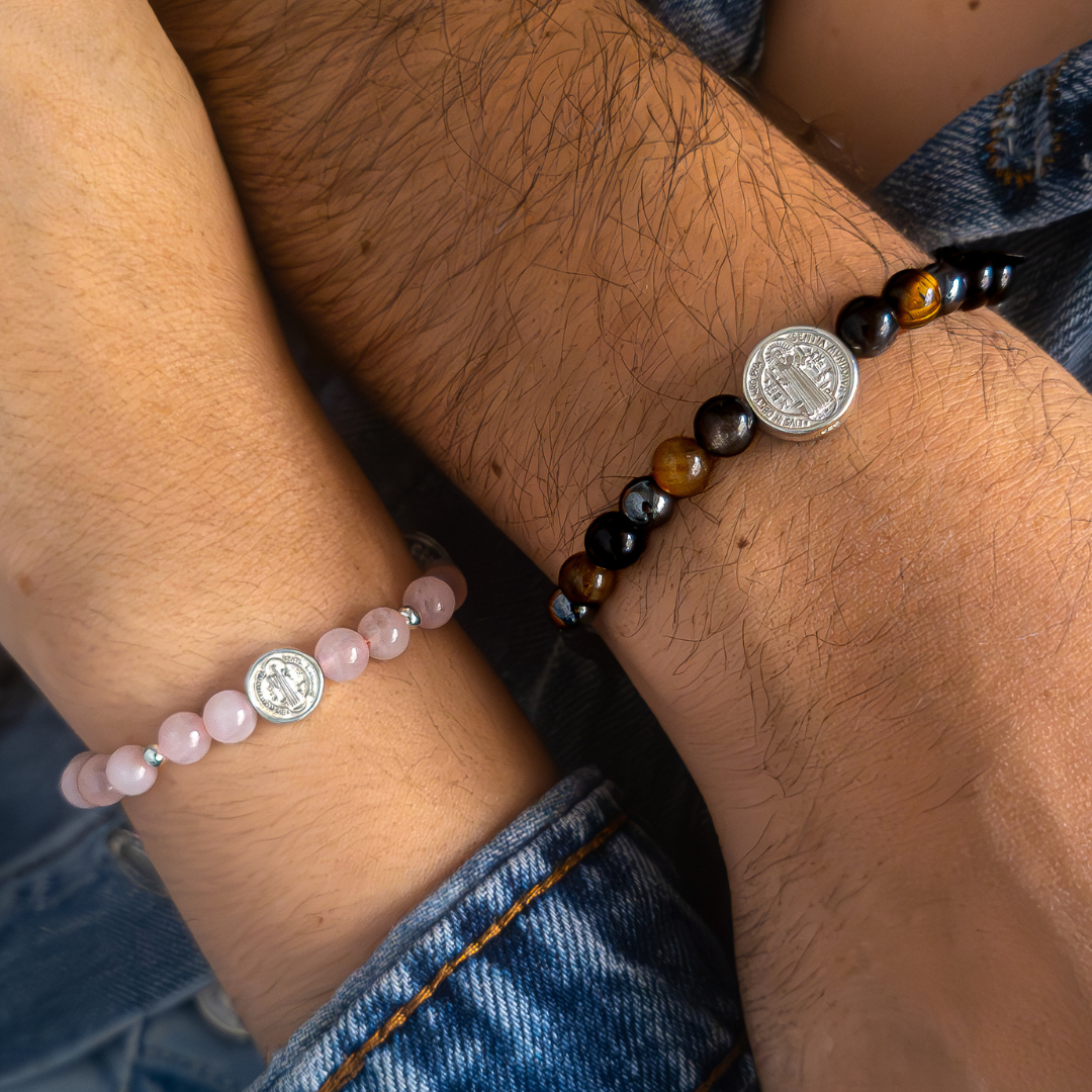 Este Dúo Cuarzo Rosa + Protección Total - San Benito fue creado para representar el equilibrio perfecto entre amor y protección. Dos pulseras pensadas para personas que se cuidan, se acompañan y se desean bienestar mutuo.